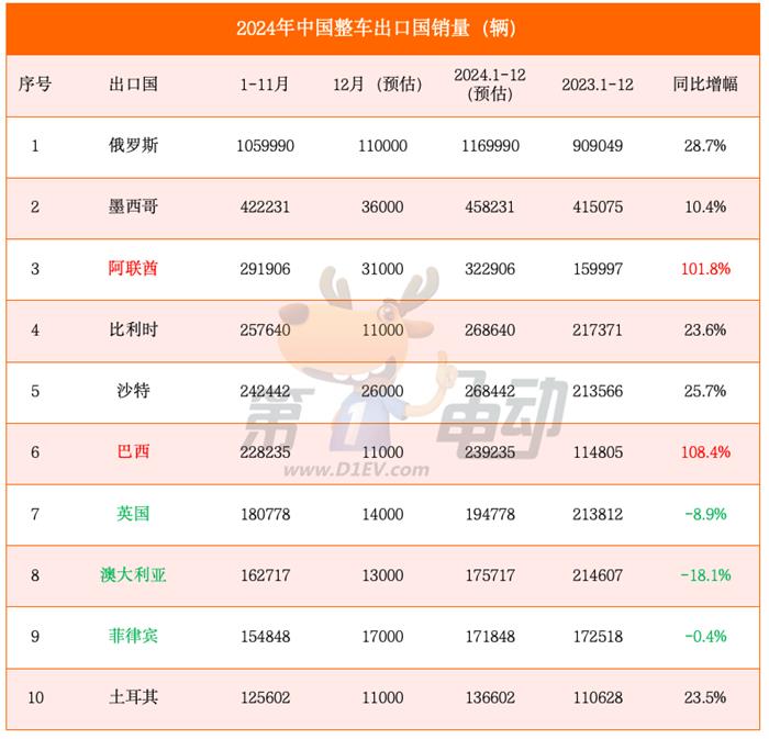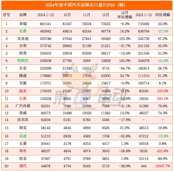 2024年度中国汽车出口量TOP20
