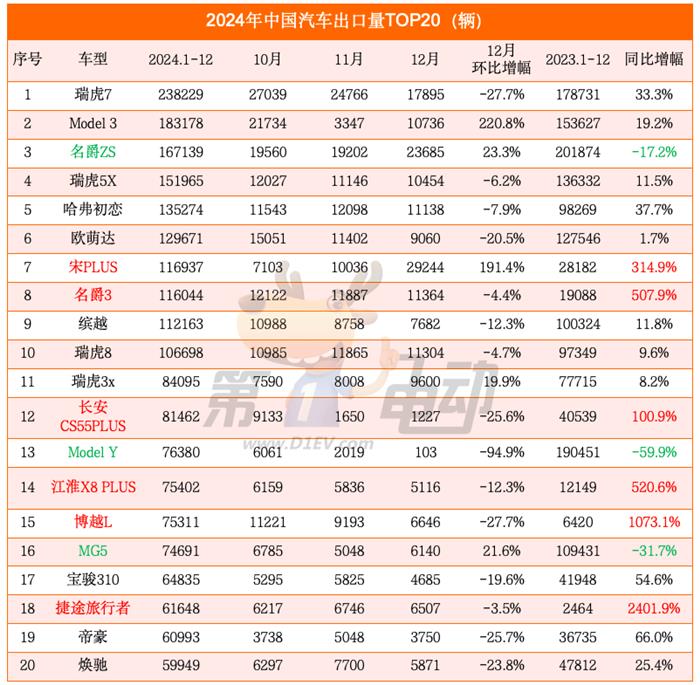 取客岁比拟,2024年出口量TOP20车型排名发生庞大变化。冠亚季军均易从,瑞虎7出口量同比大涨超33%至23。8万辆,超越名爵ZS和Model Y,夺得亚军;而曾是2023年的冠军名爵ZS出口量环比下降17%,排名下滑至第三。