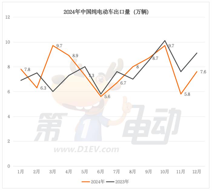 2024年纯电动车出口量达92。1万辆,同比增加0。8%。此中6月出口量创汗青新低仅5。6万辆,10月出口量立异高后,11月出口量再次跌破6万辆至5。8万辆。