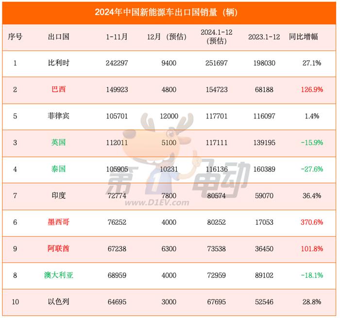 总体来看,2024年俄罗斯、、中东、欧盟和巴西成为中国汽车市场五大出口地。比利时、英国等欧洲国度和巴西、泰国等东南亚是中国汽车出口从力标的目的;非欧盟的欧洲国度和印度、马来西亚等两类市场表示较强。